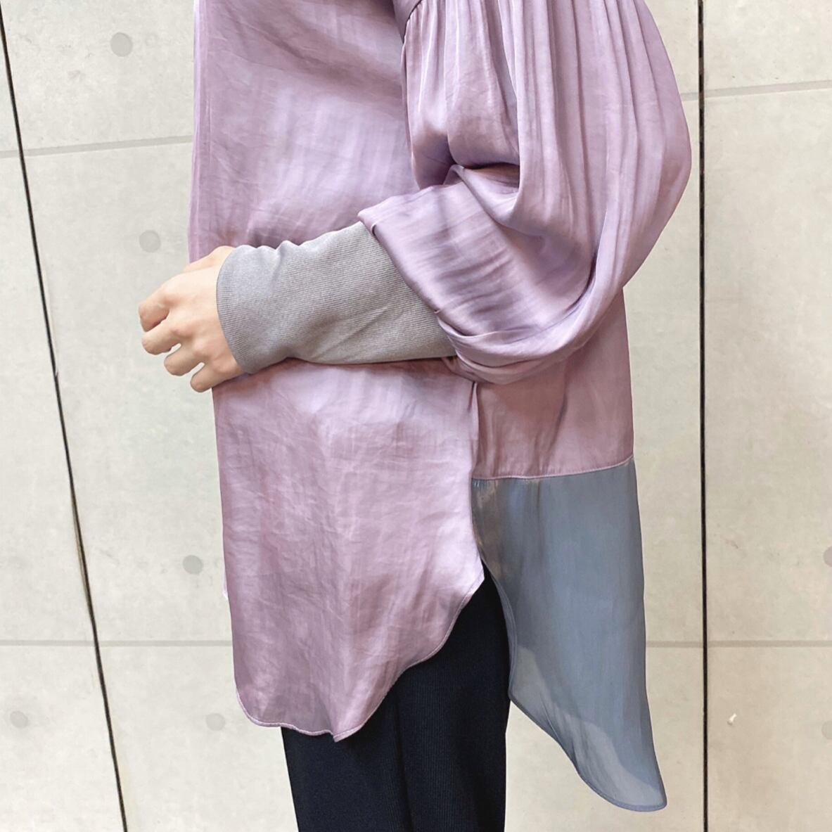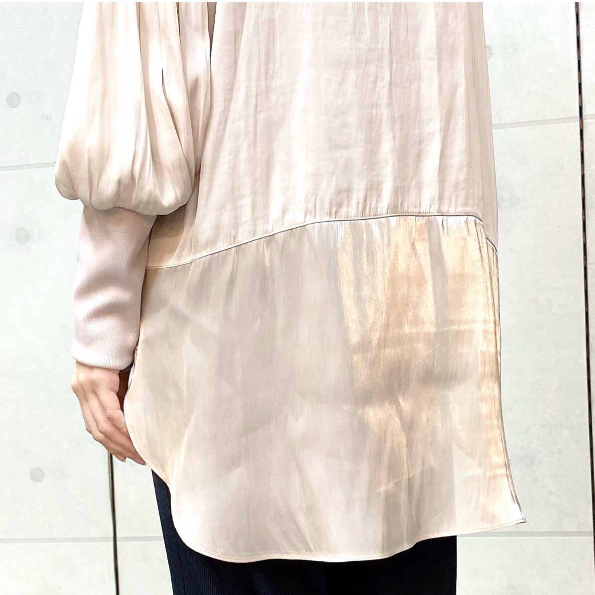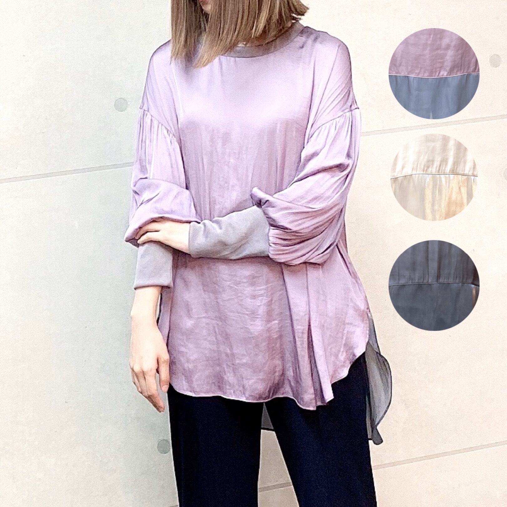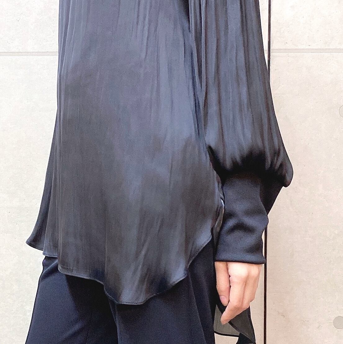 割繊糸サテン生地で仕立てた、とろみ素材のブラウス。