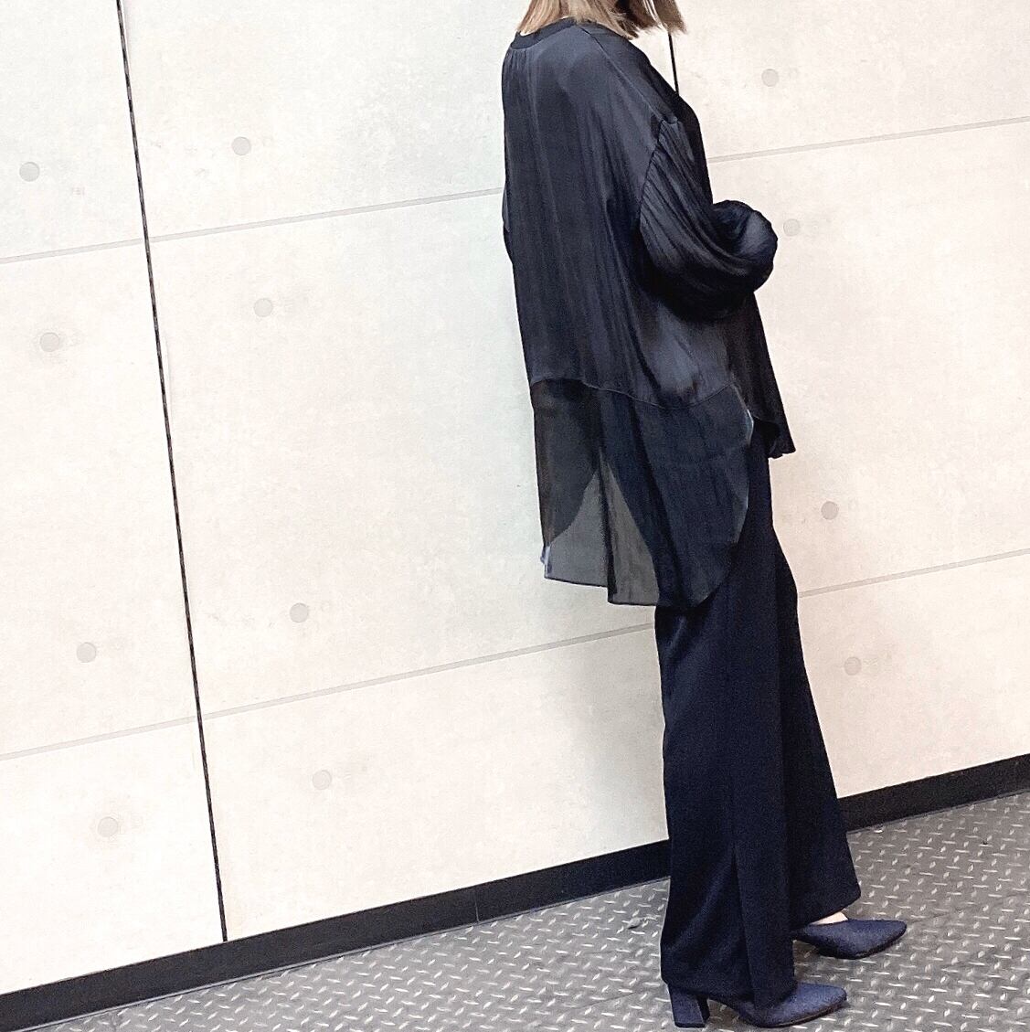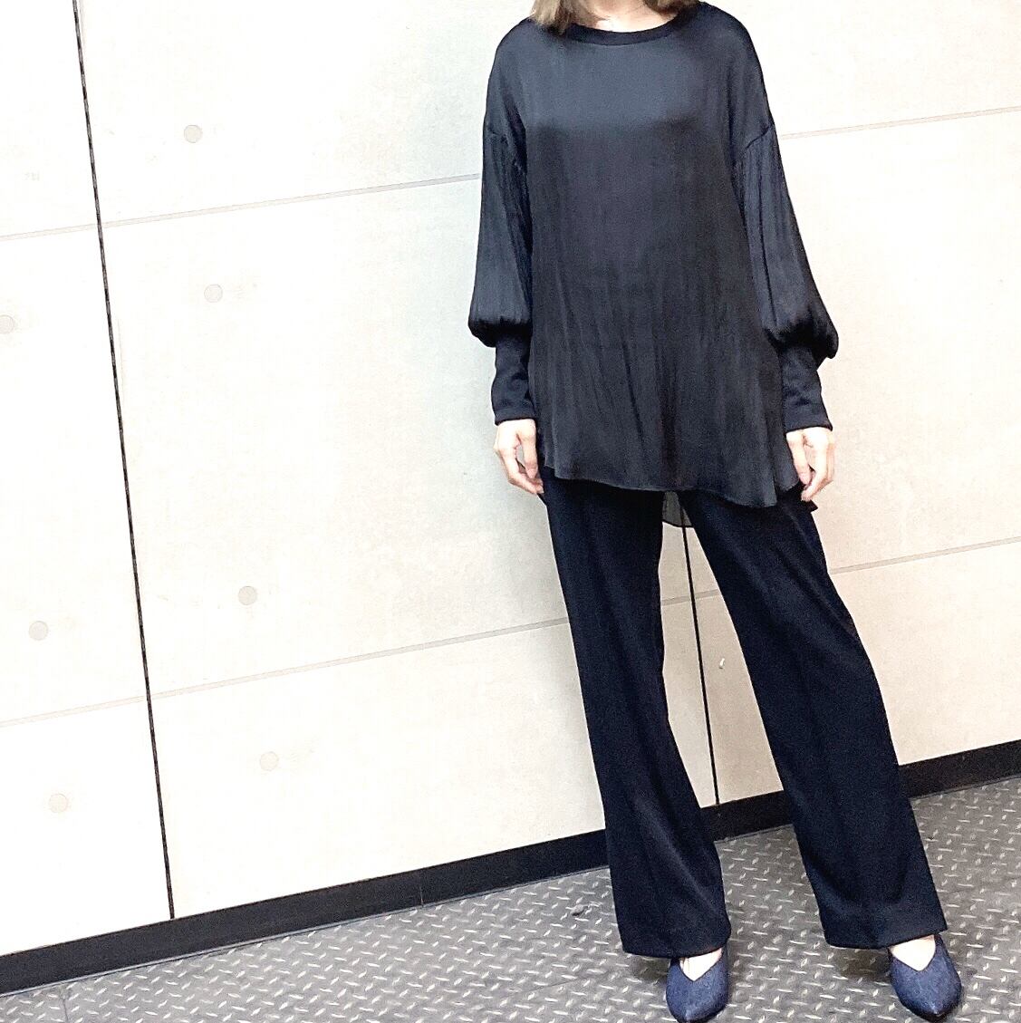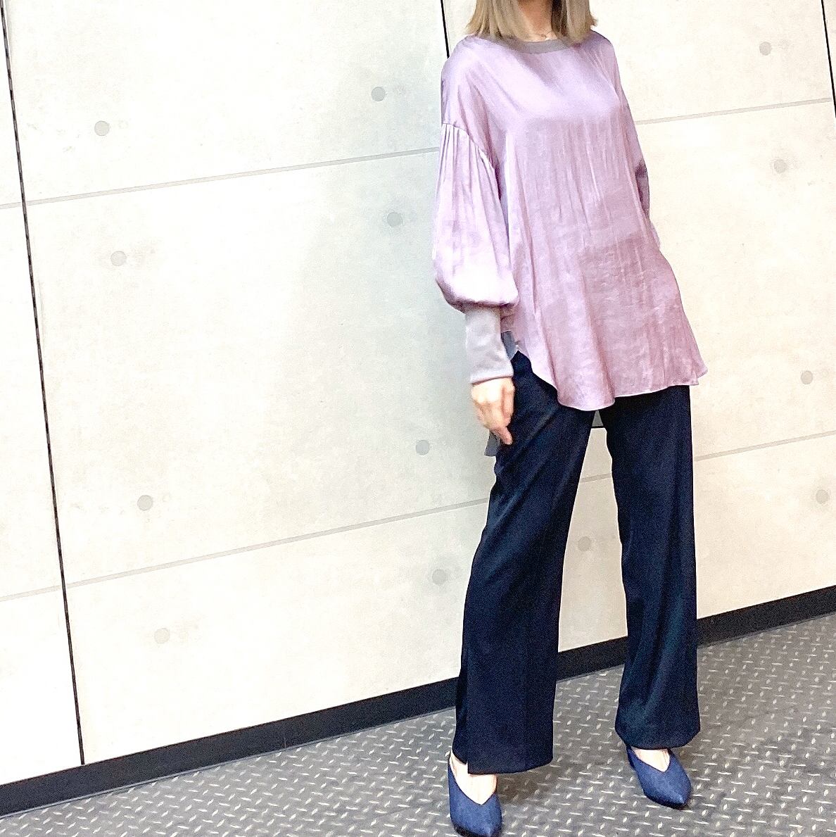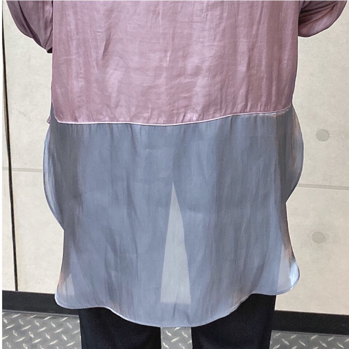 割繊糸サテン生地で仕立てた、とろみ素材のブラウス。