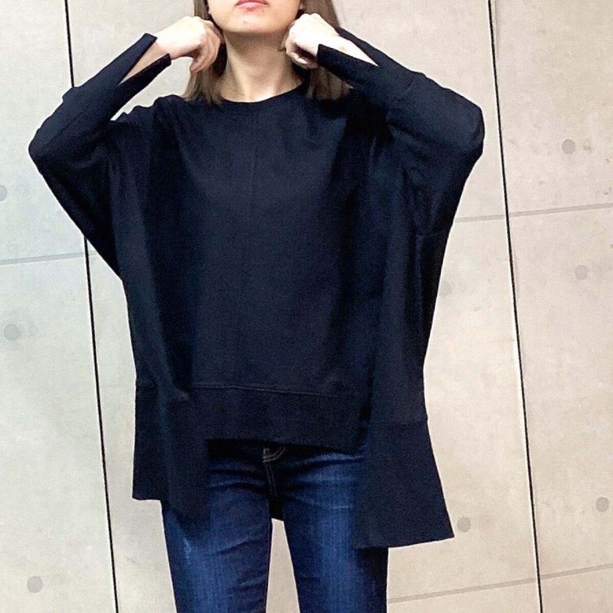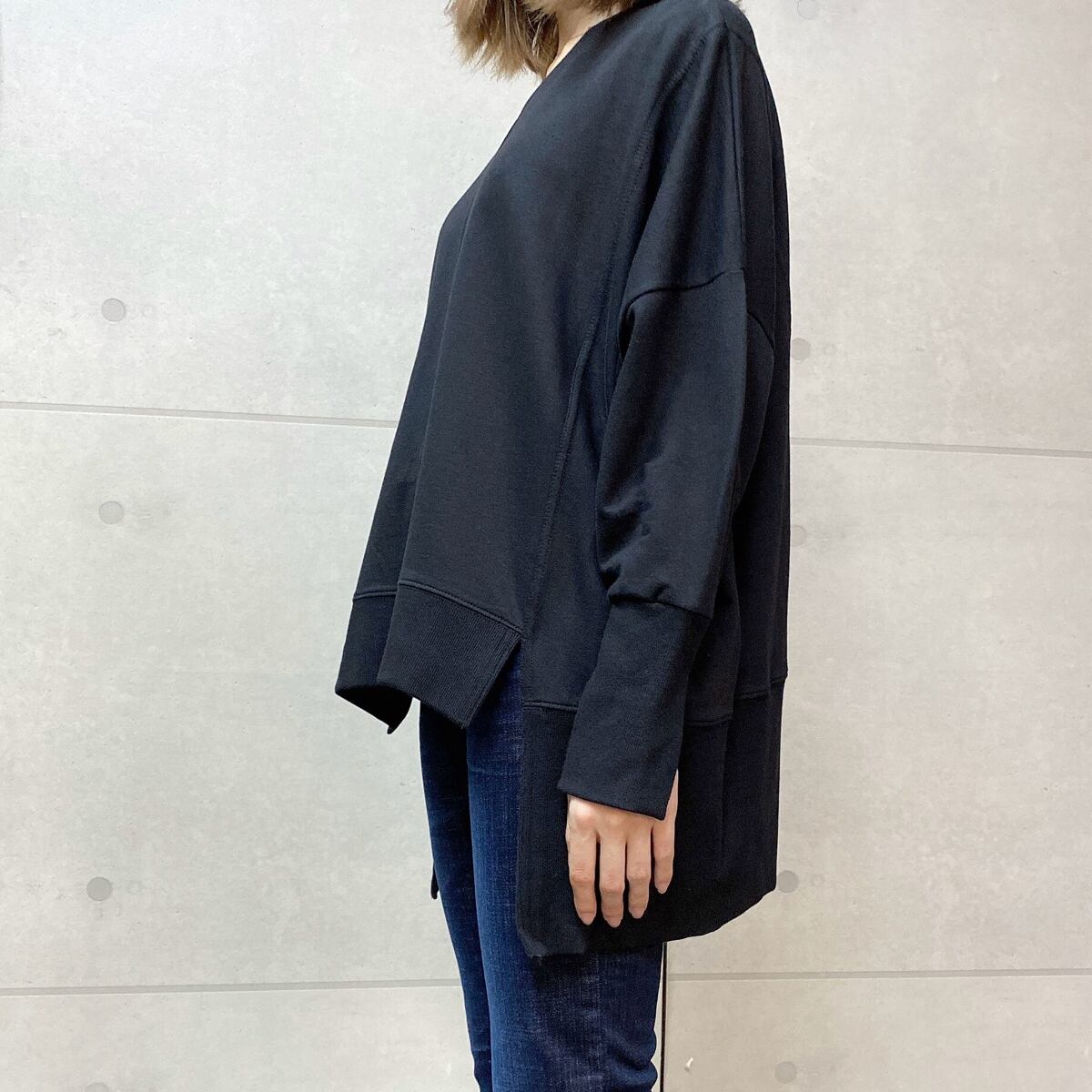 スタンダードなプルオーバーに、アシンメトリーな切替とイレギュラーヘムのひとひねりを加えて、個性的なトップスに仕上がっています。