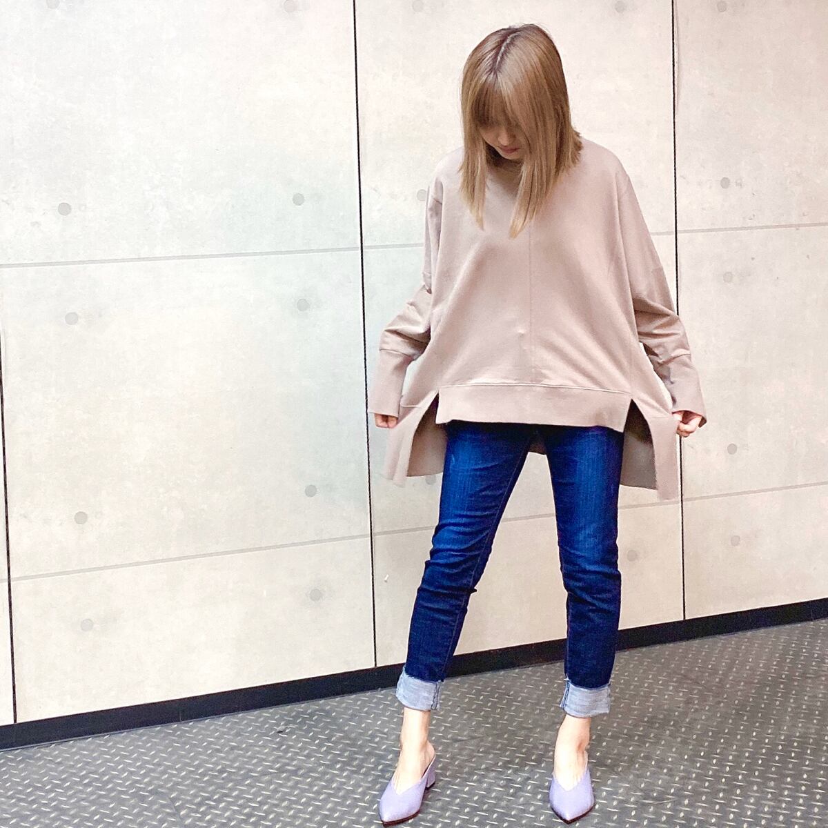 裏毛の素材がメンズライクな雰囲気もありながら、オーバーサイズで女性らしい華奢感が演出されます。お尻が隠れるので、体型カバーにも◎