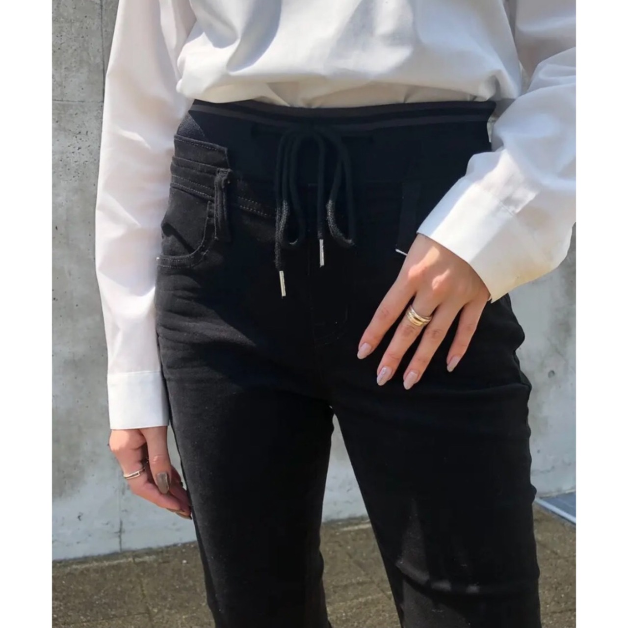 ウエストの太目ゴムは紐での調整も可能で体型カバーにも。