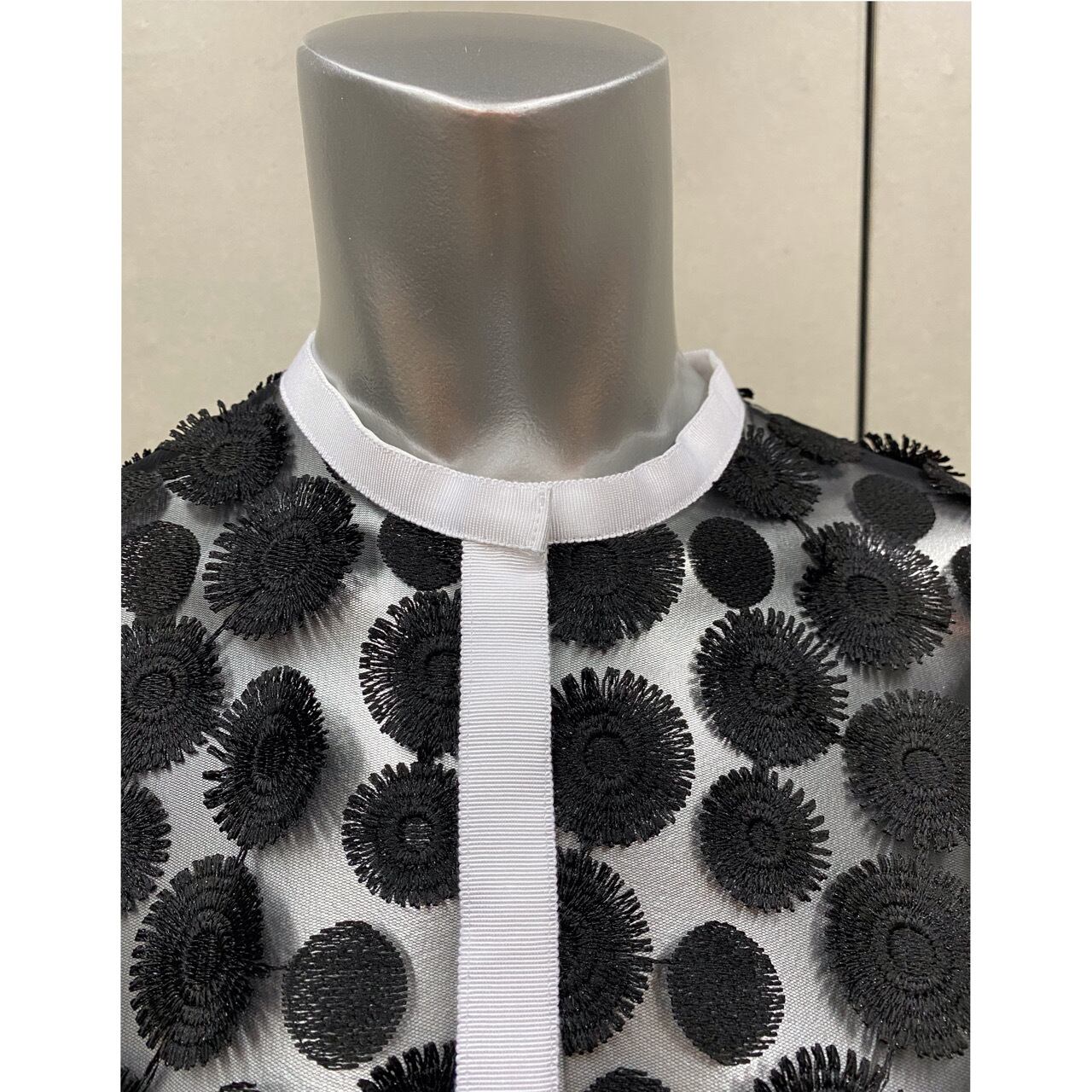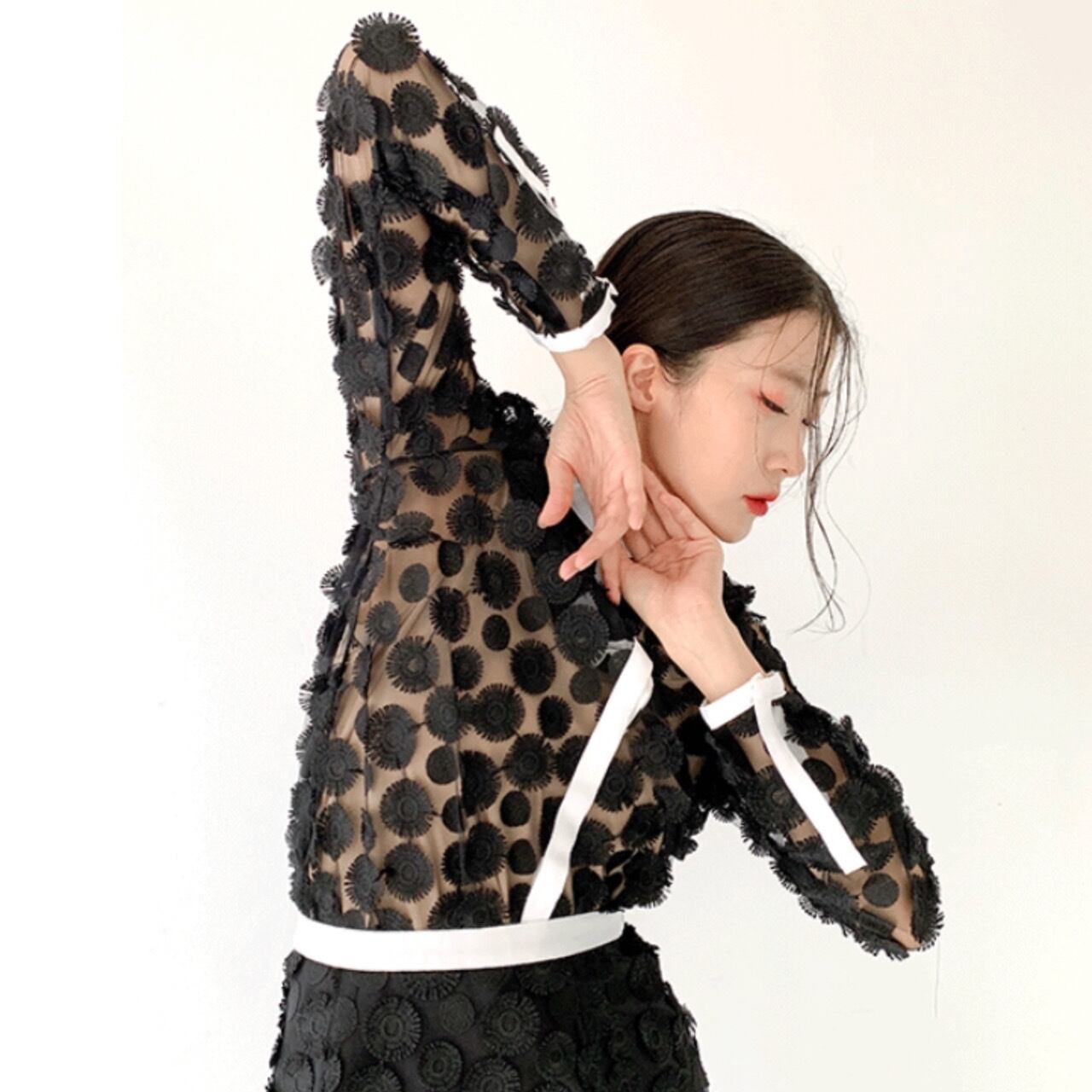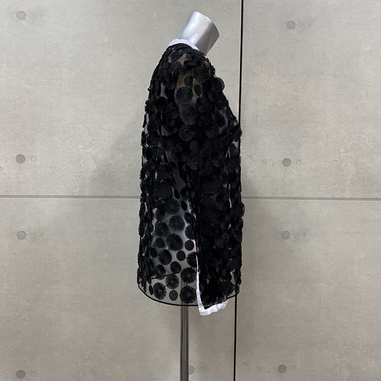 【Adonisisアドニシス】3D刺繍ドットチュールブラウス ブラック シャツ 立体 デザイン シアー ノーカラー 羽織 フリンジ 日本製 シアーブラウス 黒 S21105