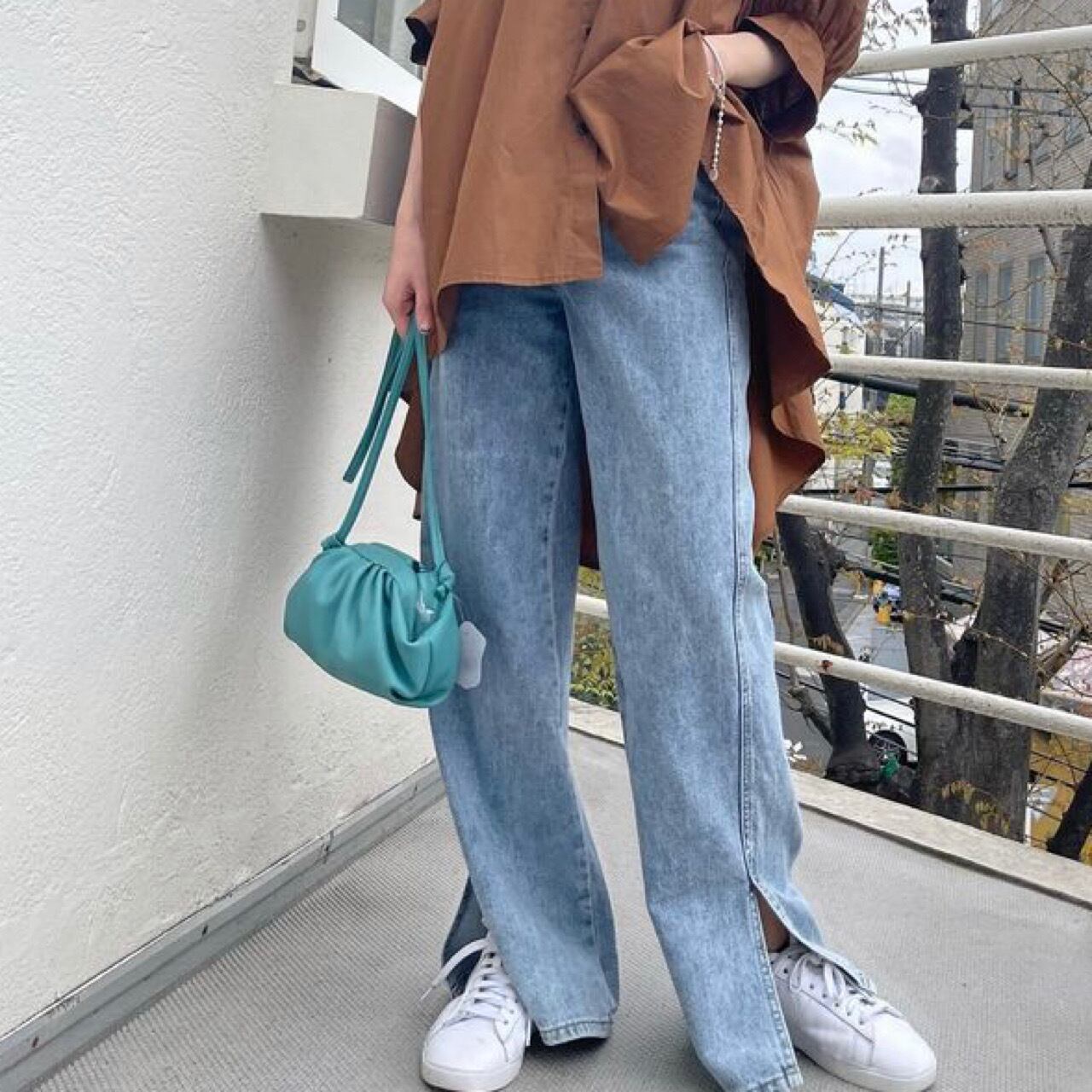 【PaulineBleu ポリーヌブロー】スリットワイドデニム ハイウエスト 美シルエット 薄い色 トレンド コットン 綿 ジーンズ ジーパン 71981